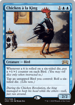 Whenever a 6 is rolled on a six-sided die, put a +1/+1 counter on each Bird. (You may roll dice only when instructed to.) Tap an untapped Bird you control: Roll a six-sided die. (Like now.)