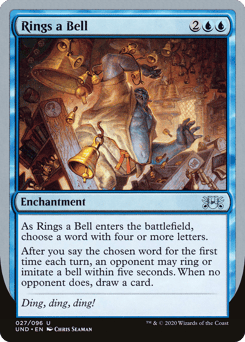 As this enchantment enters, choose a word with four or more letters. After you say the chosen word for the first time each turn, an opponent may ring or imitate a bell within five seconds. When no opponent does, draw a card.