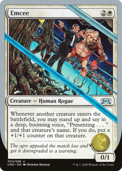 Whenever another creature enters, you may stand up and say in a deep, booming voice, "Presenting . . . " and that creature's name. If you do, put a +1/+1 counter on that creature.