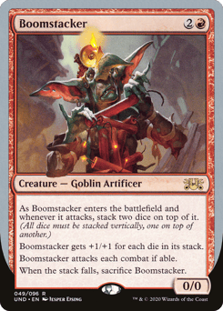 As this creature enters and whenever it attacks, stack two dice on top of it. (All dice must be stacked vertically, one on top of another.) This creature gets +1/+1 for each die in its stack. This creature attacks each combat if able. When the stack falls, sacrifice this creature.
