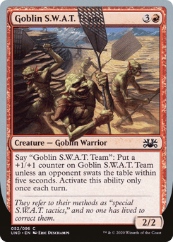 Say "Goblin S.W.A.T. Team": Put a +1/+1 counter on this creature unless an opponent swats the table within five seconds. Activate only once each turn.