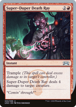 Trample (This spell can deal excess damage to its target's controller.) Super-Duper Death Ray deals 4 damage to target creature.
