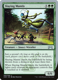 Just a second (As long as this spell is on the stack, players can't move permanents.) This creature enters by being thrown from a distance of at least three feet. When this creature enters, it fights each creature an opponent controls that it touched as it entered.