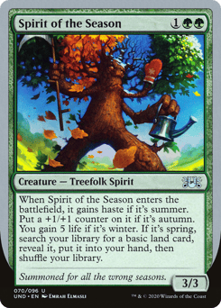 When this creature enters, it gains haste if it's summer. Put a +1/+1 counter on it if it's autumn. You gain 5 life if it's winter. If it's spring, search your library for a basic land card, reveal it, put it into your hand, then shuffle.