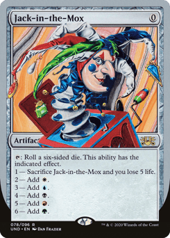 {T}: Roll a six-sided die. This ability has the indicated effect. 1 — Sacrifice this artifact and you lose 5 life. 2 — Add {W}. 3 — Add {U}. 4 — Add {B}. 5 — Add {R}. 6 — Add {G}.