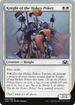 First strike {1}{W}, Do the Hokey Pokey: Prevent all damage a source of your choice would deal to this creature this turn. (To do the Hokey Pokey, choose an arm, a leg, or your whole self and put it in. Put it out. Put it in. Shake it all about. You do the Hokey Pokey! Turn yourself around.)