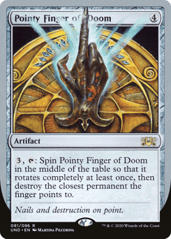 {3}, {T}: Spin this artifact in the middle of the table so that it rotates completely at least once, then destroy the closest permanent the finger points to.