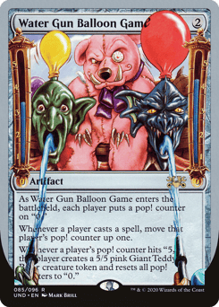 As this artifact enters, each player puts a pop! counter on "0." Whenever a player casts a spell, move that player's pop! counter up one. Whenever a player's pop! counter hits "5," that player creates a 5/5 pink Giant Teddy Bear creature token and resets all pop! counters to "0."