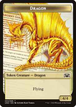 Equipped creature gets +2/+2 and has protection from Rogues and from Clerics. Whenever equipped creature deals combat damage to a player, create a 4/4 gold Dragon creature token with flying and roll a d20 (a twenty-sided die). If you roll a 20, repeat this process. Equip {2}