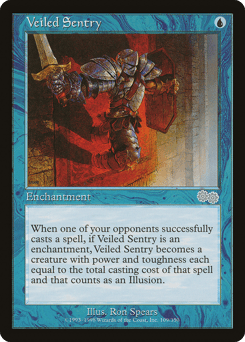 Whenever an opponent casts a creature spell, if this permanent is an enchantment, it becomes a 2/4 Soldier creature. {0}: This permanent becomes an enchantment.