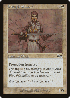 {W}: The next time a red source of your choice would deal damage to you this turn, prevent that damage. Cycling {2} ({2}, Discard this card: Draw a card.)
