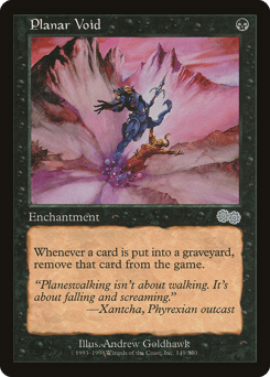 Prevent all damage that would be dealt to you by sources you don't control. When a card is put into your graveyard from anywhere, sacrifice this enchantment.