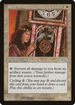 {W}: The next time an artifact source of your choice would deal damage to you this turn, prevent that damage. Cycling {2} ({2}, Discard this card: Draw a card.)