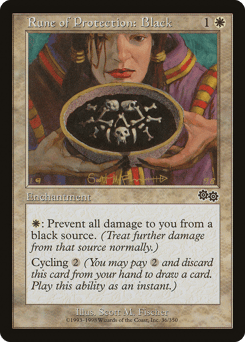 {W}: The next time a black source of your choice would deal damage to you this turn, prevent that damage. Cycling {2} ({2}, Discard this card: Draw a card.)