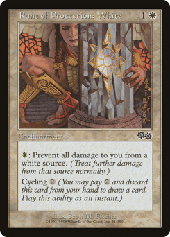 {W}: The next time a white source of your choice would deal damage to you this turn, prevent that damage. Cycling {2} ({2}, Discard this card: Draw a card.)