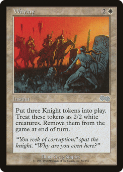 Create three 2/2 white Knight creature tokens. Exile them at the beginning of the next cleanup step.