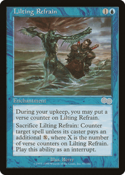 At the beginning of your upkeep, you may put a verse counter on this enchantment. Sacrifice this enchantment: Counter target spell unless its controller pays {X}, where X is the number of verse counters on this enchantment.