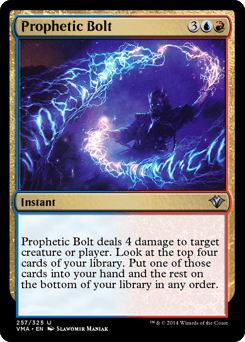 Prophetic Bolt deals 4 damage to any target. Look at the top four cards of your library. Put one of those cards into your hand and the rest on the bottom of your library in any order.