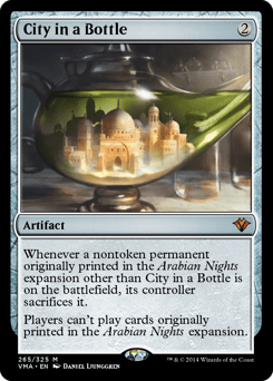 Whenever one or more other nontoken permanents with a name originally printed in the Arabian Nights expansion are on the battlefield, their controllers sacrifice them. Players can't cast spells or play lands with a name originally printed in the Arabian Nights expansion.