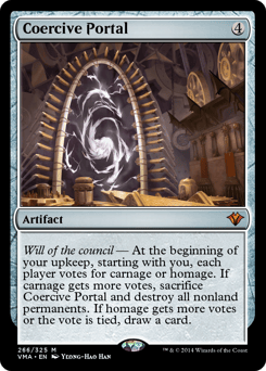 Will of the council — At the beginning of your upkeep, starting with you, each player votes for carnage or homage. If carnage gets more votes, sacrifice this artifact and destroy all nonland permanents. If homage gets more votes or the vote is tied, draw a card.