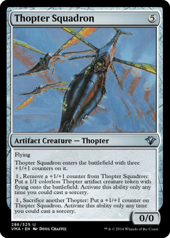 Flying This creature enters with three +1/+1 counters on it. {1}, Remove a +1/+1 counter from this creature: Create a 1/1 colorless Thopter artifact creature token with flying. Activate only as a sorcery. {1}, Sacrifice another Thopter: Put a +1/+1 counter on this creature. Activate only as a sorcery.