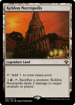 {T}: Add {C}. {4}{R}, {T}, Sacrifice a creature: Keldon Necropolis deals 2 damage to any target.