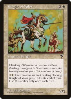 Flanking (Whenever a creature without flanking blocks this creature, the blocking creature gets -1/-1 until end of turn.) {1}{W}: Each creature without flanking blocking this creature gets -1/-1 until end of turn. Activate only once each turn.