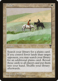 Search your library for a Plains card. If target opponent controls more lands than you, you may search your library for an additional Plains card. Reveal those cards, put them into your hand, then shuffle.