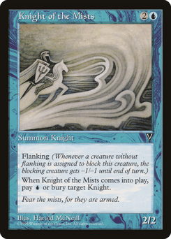 Flanking (Whenever a creature without flanking blocks this creature, the blocking creature gets -1/-1 until end of turn.) When this creature enters, you may pay {U}. If you don't, destroy target Knight and it can't be regenerated.
