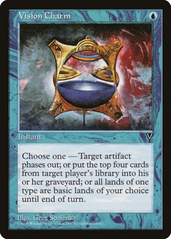 Choose one — • Target player mills four cards. • Choose a land type and a basic land type. Each land of the first chosen type becomes the second chosen type until end of turn. • Target artifact phases out. (While it's phased out, it's treated as though it doesn't exist. It phases in before its controller untaps during their next untap step.)