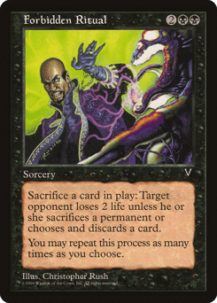 Sacrifice a nontoken permanent. If you do, target opponent loses 2 life unless that player sacrifices a permanent of their choice or discards a card. You may repeat this process any number of times.