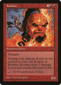 Trample At the beginning of your upkeep, if you don't control a creature named Keeper of Kookus, this creature deals 3 damage to you and attacks this turn if able. {R}: This creature gets +1/+0 until end of turn.