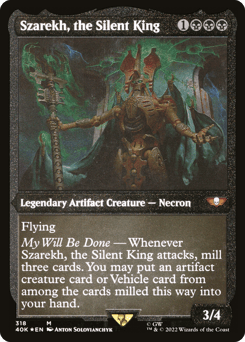 Flying My Will Be Done — Whenever Szarekh, the Silent King attacks, mill three cards. You may put an artifact creature card or Vehicle card from among the cards milled this way into your hand.