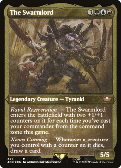 Rapid Regeneration — The Swarmlord enters with two +1/+1 counters on it for each time you've cast your commander from the command zone this game. Xenos Cunning — Whenever a creature you control with a counter on it dies, draw a card.