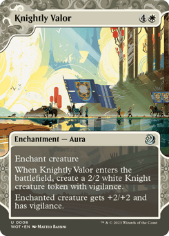 Enchant creature When this Aura enters, create a 2/2 white Knight creature token with vigilance. (Attacking doesn't cause it to tap.) Enchanted creature gets +2/+2 and has vigilance.