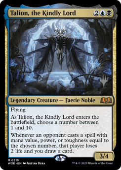Flying As Talion enters, choose a number between 1 and 10. Whenever an opponent casts a spell with mana value, power, or toughness equal to the chosen number, that player loses 2 life and you draw a card.
