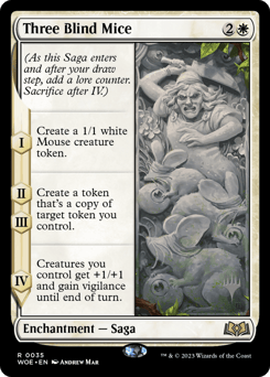 (As this Saga enters and after your draw step, add a lore counter. Sacrifice after IV.) I — Create a 1/1 white Mouse creature token. II, III — Create a token that's a copy of target token you control. IV — Creatures you control get +1/+1 and gain vigilance until end of turn.