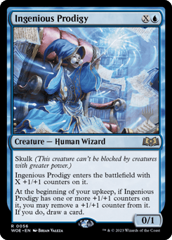 Skulk (This creature can't be blocked by creatures with greater power.) This creature enters with X +1/+1 counters on it. At the beginning of your upkeep, if this creature has one or more +1/+1 counters on it, you may remove a +1/+1 counter from it. If you do, draw a card.