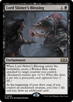 When this enchantment enters, create a Wicked Role token attached to target creature you control. (Enchanted creature gets +1/+1. When this token is put into a graveyard, each opponent loses 1 life.) At the beginning of your draw step, if you control an enchanted creature, you lose 1 life and you draw an additional card.