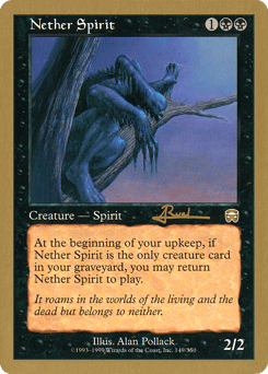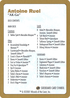 A member of the famous Team Block Ops, Antoine Ruel, a native of Aubervilliers, France, took his blue-black-red control deck to a third-place finish at this year's World Championships. Ruel credits his teammate Laurent Pagorek for the deck that he calls "AK-Go." The deck, which Ruel played to a 5—1 record during the Standard portion of the tournament, relies on card drawing (most notably Accumulated Knowledge, or "AK" for short), countermagic ("Go," for short), red for board control, and Nether Spirits for the win.