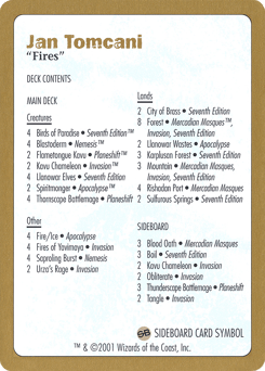 Jan Tomcani, from Bratislava in the Slovak Republic, came out of nowhere to stun everyone by posting a perfect 6—0 record in the Standard portion of this year's Worlds. Tomcani then proved that his run was no fluke by working his way up to the quarterfinals, where he lost to Alex Borteh in a close five-game match. Tomcani played a version of "Fires," the green-red deck that defined much of this year's metagame. Tomcani's version, which splashed black, follows the normal Fires archetype of playing cheap creatures followed by Fires of Yavimaya and big creatures like Blastoderm or Spiritmonger.