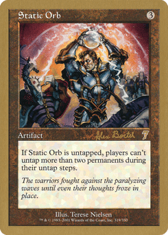 Eighteen-year-old Alex Borteh came on strong in the last half of the 2000—2001 Pro Tour™ season. He posted an impressive Top 8 finish at U.S. Nationals and followed that up by coming within one match of winning this year's Worlds. The soon-to-be Ohio State University freshman played a monoblue combo deck that he liked to call "Da Folk." This deck wins by using Opposition and Static Orb to establish a lock down while legions of Merfolk overrun opponents' immobilized defenses.