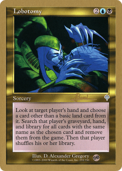 Target player reveals their hand, then you choose a card other than a basic land card from it. Search that player's graveyard, hand, and library for all cards with the same name as the chosen card and exile them. Then that player shuffles.