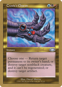 Choose one — • Return target permanent to its owner's hand. • Destroy target nonblack creature. It can't be regenerated. • Destroy target artifact.