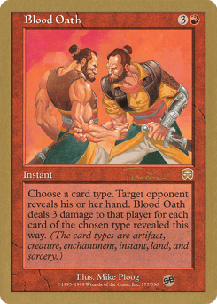 Choose a card type. Target opponent reveals their hand. Blood Oath deals 3 damage to that player for each card of the chosen type revealed this way. (Artifact, battle, creature, enchantment, instant, kindred, land, planeswalker, and sorcery are card types.)