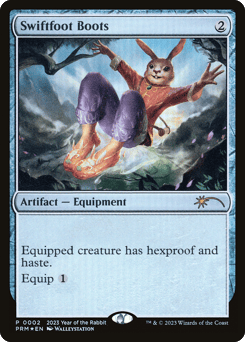 Equipped creature has hexproof and haste. (It can't be the target of spells or abilities your opponents control. It can attack and {T} no matter when it came under your control.) Equip {1} ({1}: Attach to target creature you control. Equip only as a sorcery.)
