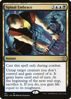 Cast this spell only during combat. Untap target creature you don't control and gain control of it. It gains haste until end of turn. At the beginning of the next end step, sacrifice it. If you do, you gain life equal to its toughness.