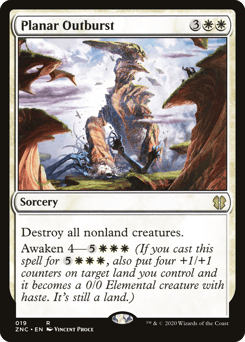 Destroy all nonland creatures. Awaken 4—{5}{W}{W}{W} (If you cast this spell for {5}{W}{W}{W}, also put four +1/+1 counters on target land you control and it becomes a 0/0 Elemental creature with haste. It's still a land.)