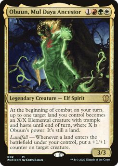 At the beginning of combat on your turn, up to one target land you control becomes an X/X Elemental creature with trample and haste until end of turn, where X is Obuun's power. It's still a land. Landfall — Whenever a land you control enters, put a +1/+1 counter on target creature.