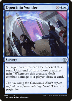 X target creatures can't be blocked this turn. Until end of turn, those creatures gain "Whenever this creature deals combat damage to a player, draw a card."